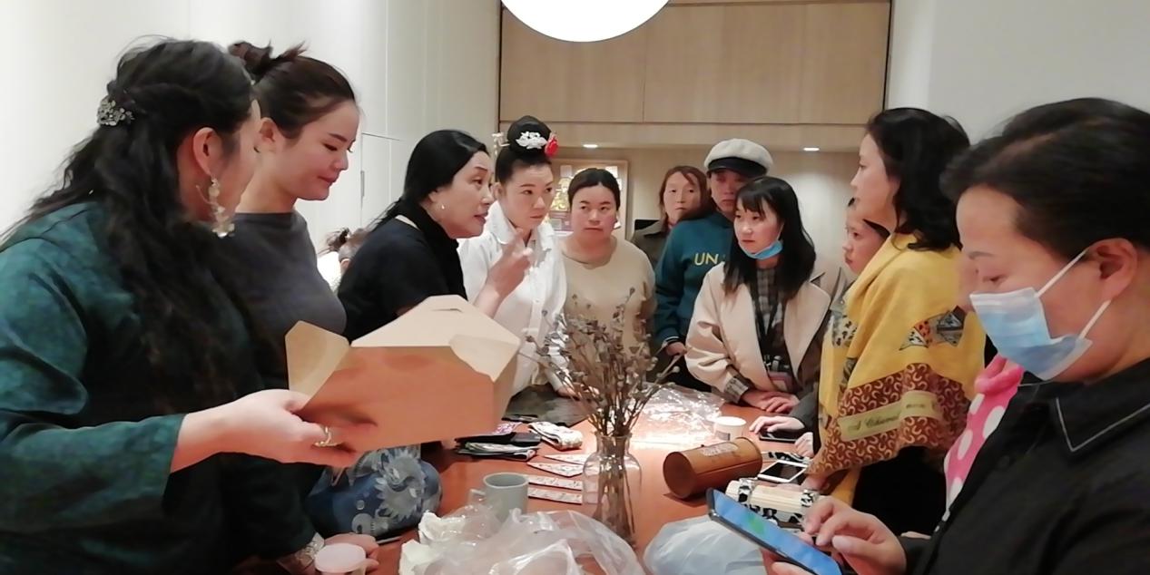 镶上铜片,再配以流苏,原本两片式有些“老土”的民族服装,顿时灵动了许多。服装设计制作者韦厚珍是老师眼中“爱动脑筋”的“学霸”,曾参加过第五期研培的她在“回归”研修中如饥似渴地学习。除了传统民族服装外,她还做出了 4套抱枕,面料、工艺手法各不相同。“从初稿设计到做出成衣,这是我第一次独立完成。东华老师们耐心地教我,启发我创新改良。” 韦厚珍谈起研修获得感、幸福感满满。一件件静态作品,让观者从中感受到植根优秀传统文化的民族工艺通过创新设计获得新生,走向国际的生动脉搏。