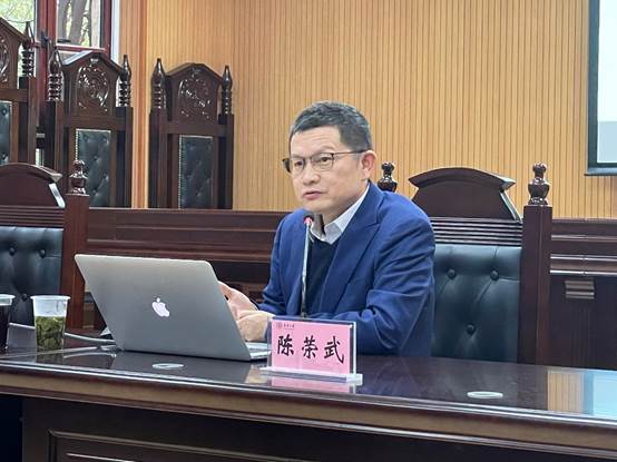 11月27日,人文学院党委“名师初心讲堂”在延安路校区模拟法庭举行。上海市党建研究会特邀研究员、上海市形势政策研究会副会长、上海市马克思主义研究会理事陈荣武教授作关于“开启全面建设社会主义现代化国家新征程——学习贯彻十九届五中全会精神”的辅导报告。人文学院党委书记韩哲宇,院长张科静,全体师生党员参加报告会。