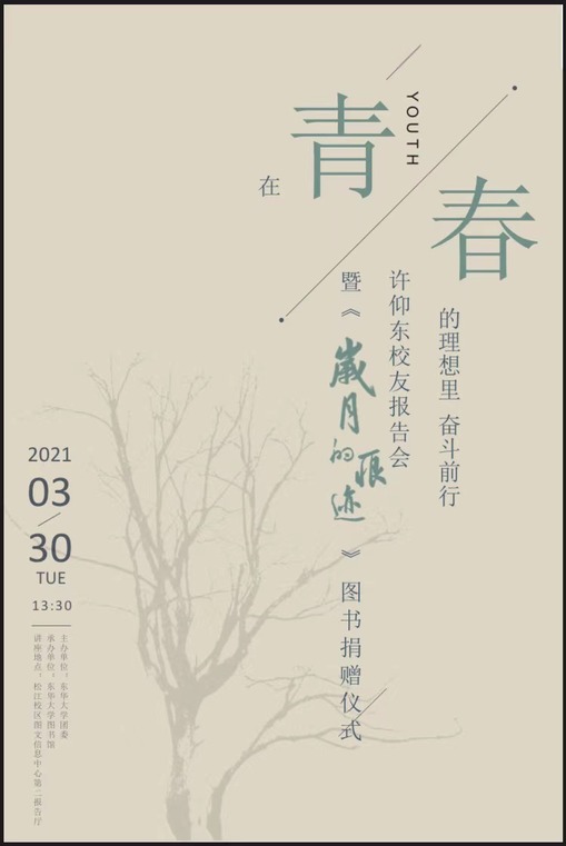 讲座内容:本期周周讲请来了东华校友许仰东先生,为我们分享他的新书——《岁月的痕迹》。该书描述的是一个中国农村的孩子从乡间小路走向魔都上海,而后闯荡西方社会的一系列人生故事,是许仰东先生第一本以“感恩”为主题的散文集。