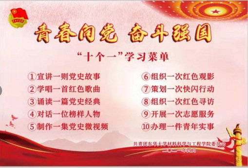 为推动党史学习教育在广大青年学生中持续升温,进一步提升团组织的凝聚力、战斗力和号召力,激发青年学生立大志、明大德、成大才、担大任,在五四青年节来临之际,材料学院面向学院全体青年开展“青春向党 奋斗强国”主题教育活动。同时,发布“十个一”党史学习教育菜单,包括宣讲一则党史故事、学唱一首红色歌曲、诵读一篇党史经典、对话一位榜样人物、制作一集党史微视频、组织一次红色观影、策划一次快闪行动、组织一次红色寻访、开展一次志愿服务、办理一件青年实事,以“团队打卡+个人打卡”相结合的模式,让青年学生党史学习教育的“自选动作”更接地气、有活力。