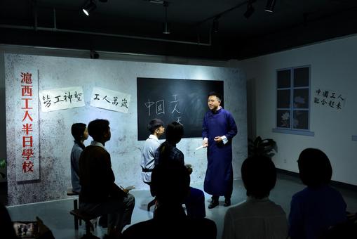 活动现场,来自全国高校“百个研究生样板党支部”——人文学院“学思先锋”硕士生党支部的学生党员,用情景演绎的形式再现中国共产党早期组织创办的第一所工人学校授课场景。“谁说‘工字不出头,出头便入土’?‘工’‘人’上下连在一起,就是个‘天’字,咱们工人可是顶天立地的!”党史学习与校史学习紧密结合,让党员干部和师生学出自己的特色和东华味道。展览动静结合,观众不仅可以静态学习参观文物史料图片,还能在动态的情景演绎中深刻感受红色纺织中的革命力量。