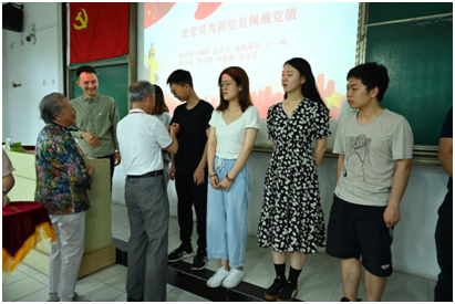 活动现场,陈雪英、贡宝彬等2位50年党龄的老党员,为学院新发展党员佩戴党徽,简朴而庄重的佩戴仪式,凝结着老一辈共产党员对青年一代的期许,象征着革命事业的薪火相传。在老党员的带领下,同学们还现场进行了入党宣誓。