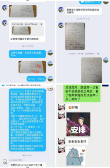 在其他深奥、抽象的数学理论课上,教师们各显神通,板书、直播齐上阵,利用工具来为网络课堂增色。李晋秀老师采用“课前视频预习+课中板书直播讲解、学习通讨论+课后微信群答疑”的方式来教授《几何与微积分A(上)》,积极引导同学们发言,达到了线上线下同质等效,课程得到班级学生和学院督导组的充分肯定。申冉和邓爱平老师教授的《高等代数2》是数学系学生必修的专业“难啃骨头”,两位老师为拉近师生距离、调动课堂气氛,不仅采取“板书直播+屏幕共享”方式来还原“面授”效果,还特意增加课前练习解答时间、课中提问频率、以及签到抽查频次来提高学生的参与积极性,同时还将较难的扩展题录屏分享到学生群,以便反复观看、消化。偶尔有学生因为学习困难而情绪低落,老师们也总能及时疏导、安慰。课程的在线教学方式受到好评。
