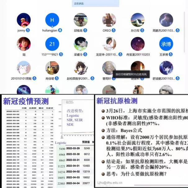 为备战五月中旬的数学建模校赛,帮助参赛同学更好地利用课余时间,理学院数学建模协会组织系列讲座。作为第一讲,胡良剑教授结合当前新冠疫情预测和抗原检测中涉及的数学问题做了《随机预测与决策》讲座,吸引了近200名同学线上“云聚一堂”。讲座既有数学基本理论的介绍,又有数学具体方法的应用,特别是应用于当前热点话题,同学们见识到了数学精准、神奇的一面。知识武装头脑,讲座充实生活,这一系列“干货满满”的讲座将陪伴同学们共度时艰,收获成长!