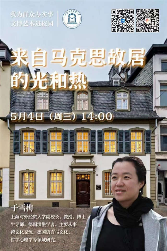5月4日,上海对外经贸大学副校长于雪梅教授采用腾讯会议与视频号直播结合的方式,向来自校内外的师生们讲述“来自马克思故居的光和热”,带领大家云游马克思故居,感受马克思及其思想带来的光和热,让历史的火焰照亮未来。
