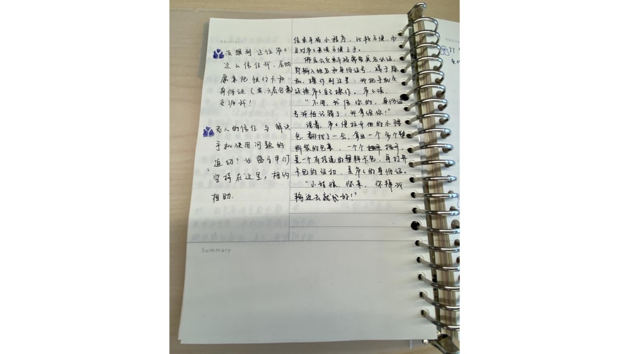 (志愿者丁诗佳写的“蓝马甲日记”,记录跟受助老人之间的小故事)