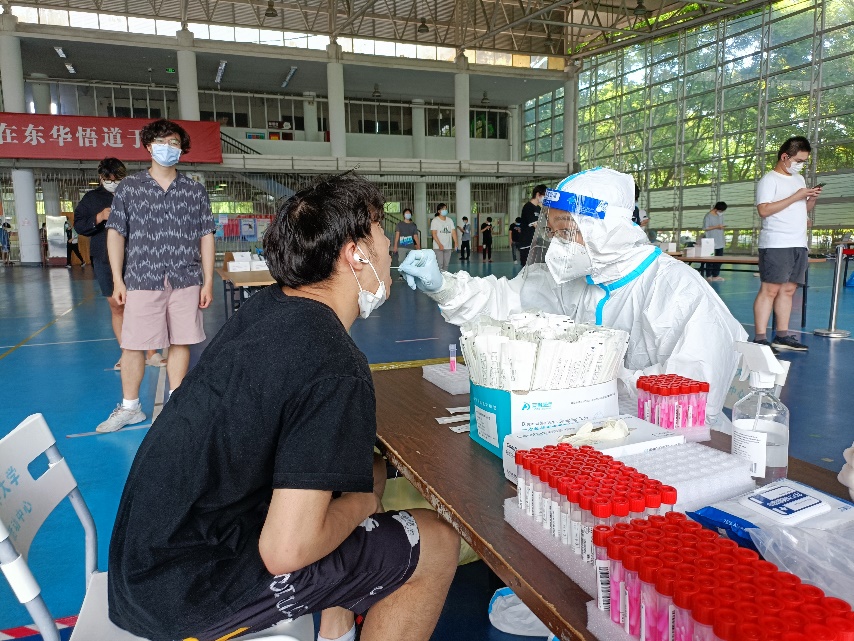 “哪里需要我们就到哪里!”采样队伍中的很多老师都是从之前送餐、校园秩序维护等志愿者岗位“一键转换”而来的,一听到学校志愿者的召集通知,大家纷纷踊跃报名,不多久,由教职工组成的核酸采样队伍就正式组建完毕。“能以这样的方式为大家做点事情,我想是我们整个核酸采样志愿者团队的初心,全体东华人都在以自己的方式守护着校园,疫情终将过去,这段特殊的志愿者经历也将成为我青春汗水过后的美好回忆。”理学院钟德俊老师说。