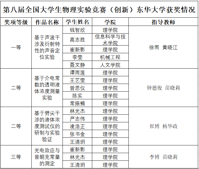 我校物理教学实验中心徐雨、黄晓江老师指导的学生参赛作品“基于声波干涉及衍射特性的声音定位实验”获命题组全国一等奖;崔博、杨华政老师指导学生的参赛作品“基于劈尖干涉的液体浓度测试仪的研制与实验验证”,钟德俊、苗晓莉老师指导学生的参赛作品“基于介电常数的透明液体浓度测量实验”获二等奖;李博、苗晓莉老师指导学生的参赛作品“光电效应与普朗克常量的测定”获讲课组全国三等奖。